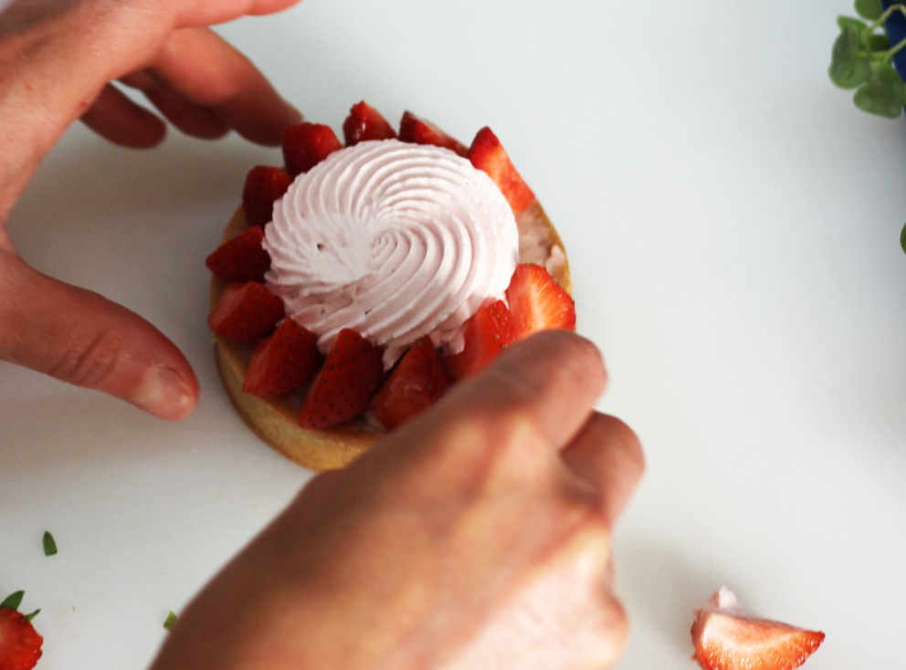 Chouquettes à la crème vanille - Macaron caramel et fleur de sel de Guérande - Tartelette fraises rhubarbe